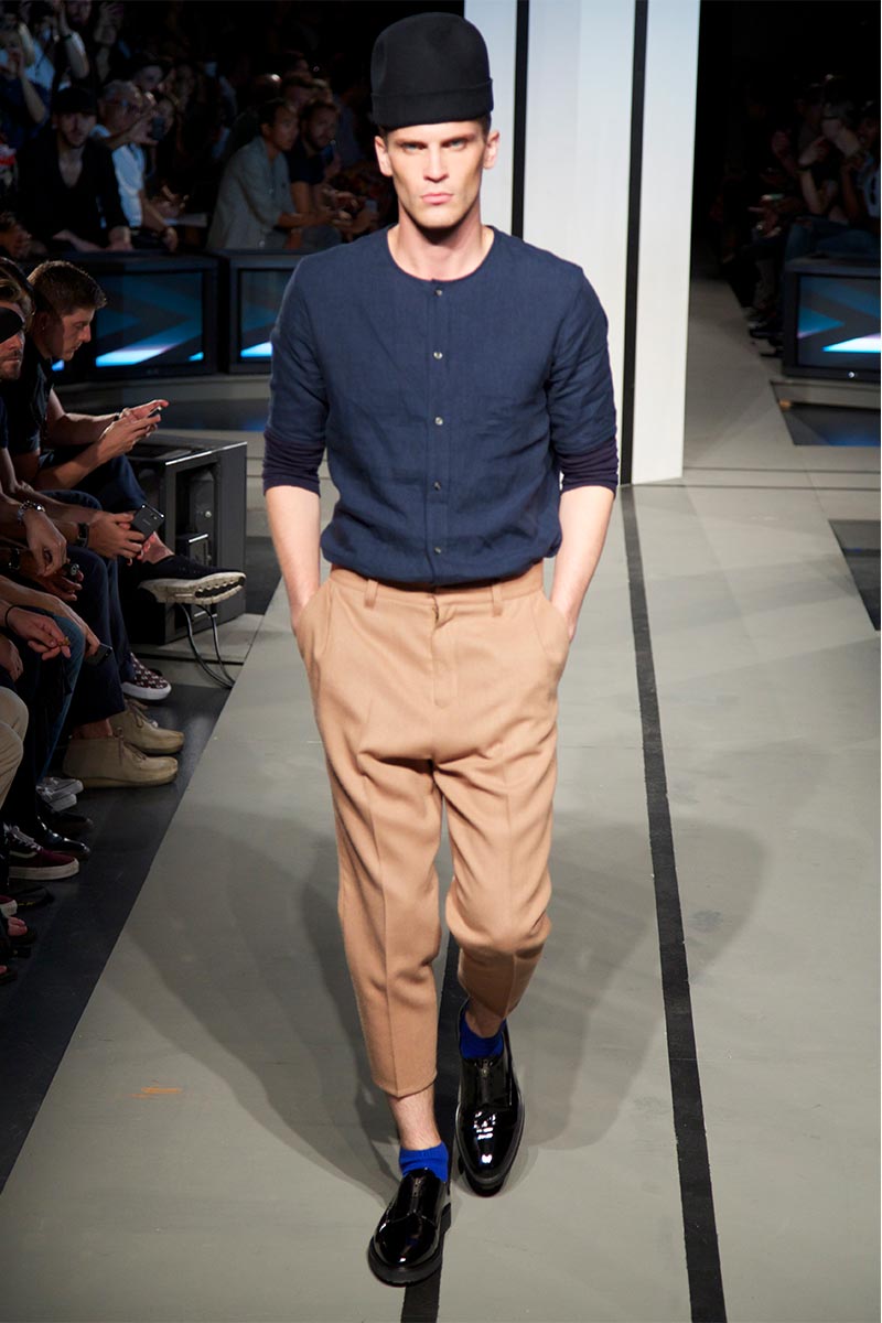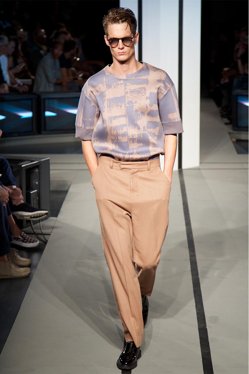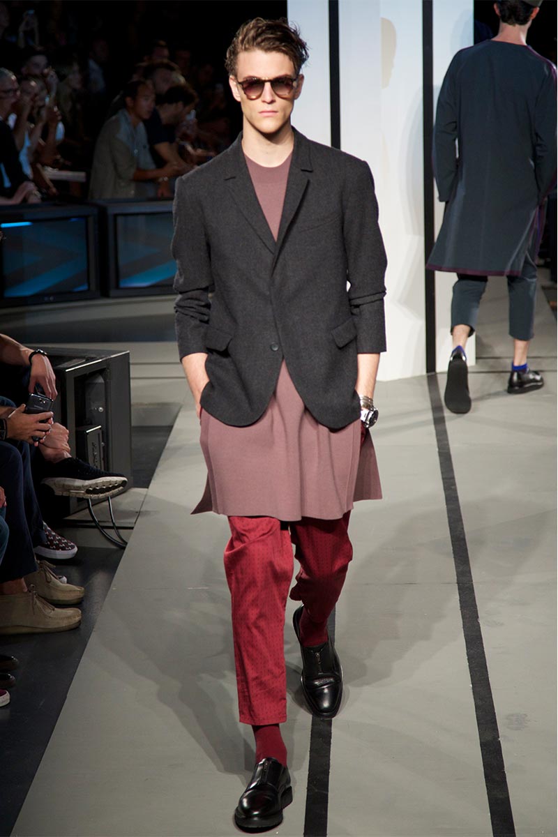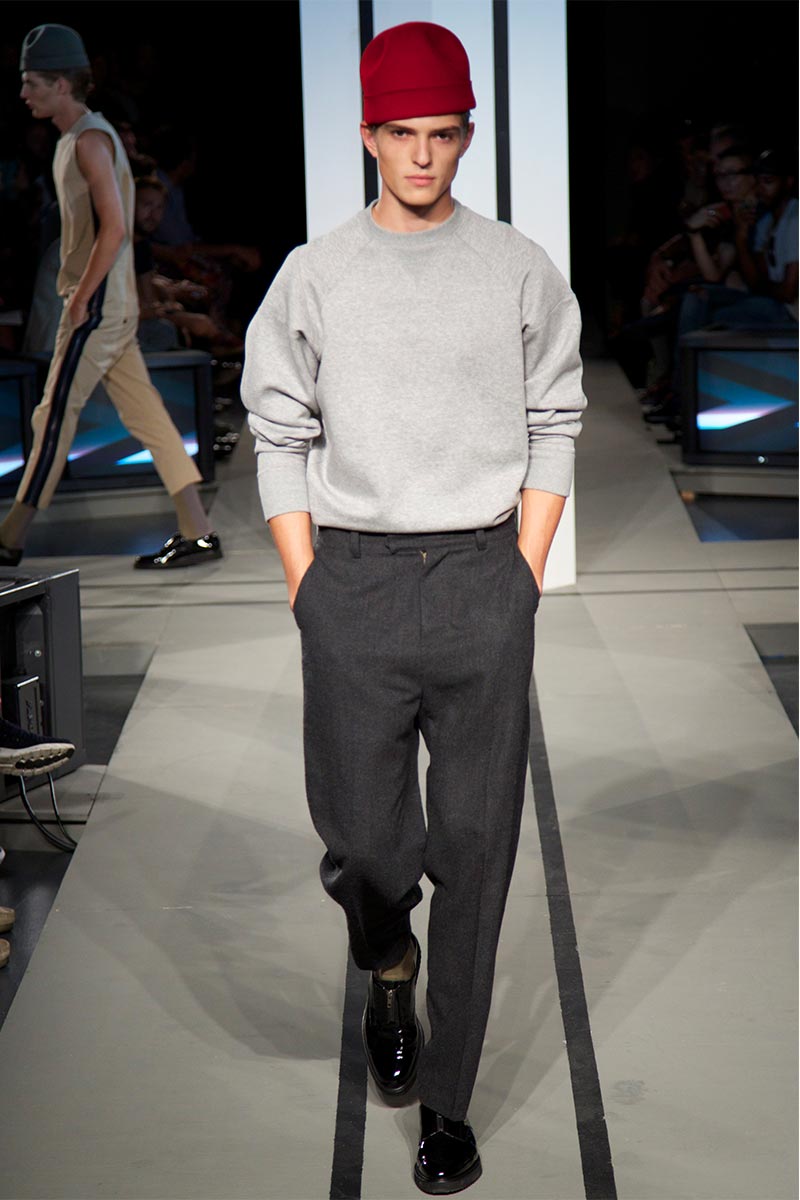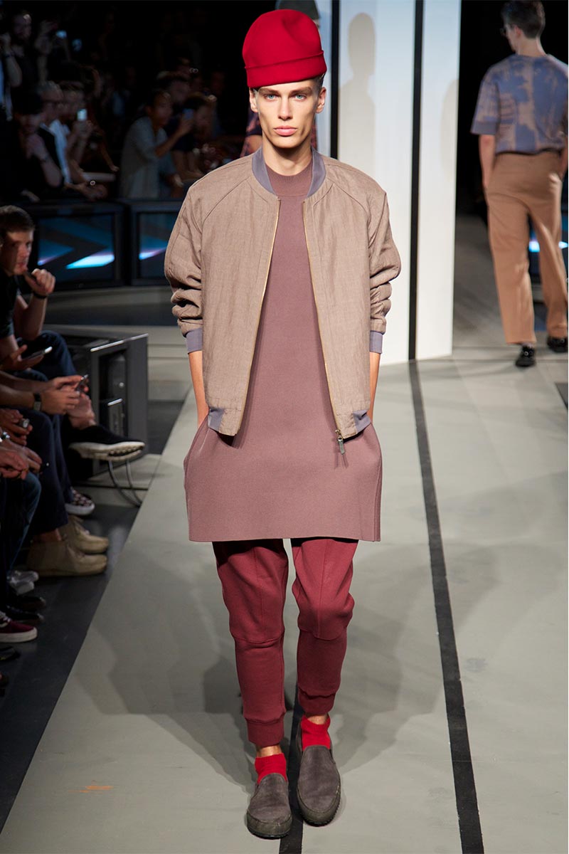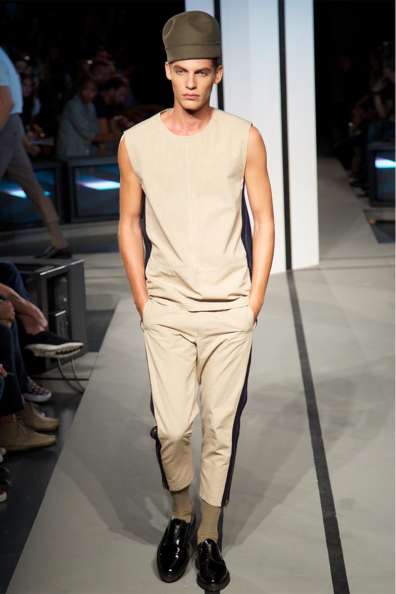 If there's a designer capable of elucidate references with unerring accuracy through the alluring construction of menswear clothes, is Robert Geller. Over the past years, across the timeline of his seasonal menswear collections, the designer proffered his fixative craze for David Bowie, Berlin, music, and constructivist art - just to name a few. But for Spring 2015, Geller found himself on another story trial, perhaps, a more experimental one. That particular philosophy conducted him towards a different context, one that reads extremely intriguing. This time attention was paid onto the two elements that reflect with precision his aesthetic, textile and color. For instance, Geller's preoccupation with color revealed the poetic and compelling attraction he has been propelling with consistency. His subdued, somber combinations of neutral tones, playing against simple, yet forward silhouettes, have that same winsome effect from previous collections. However, this offering states a new way of effortless dressing, one that does not compromises the classic garb of his menswear style.