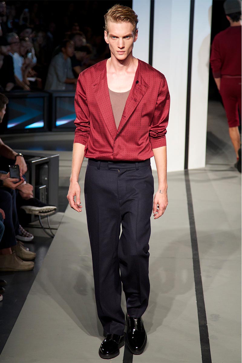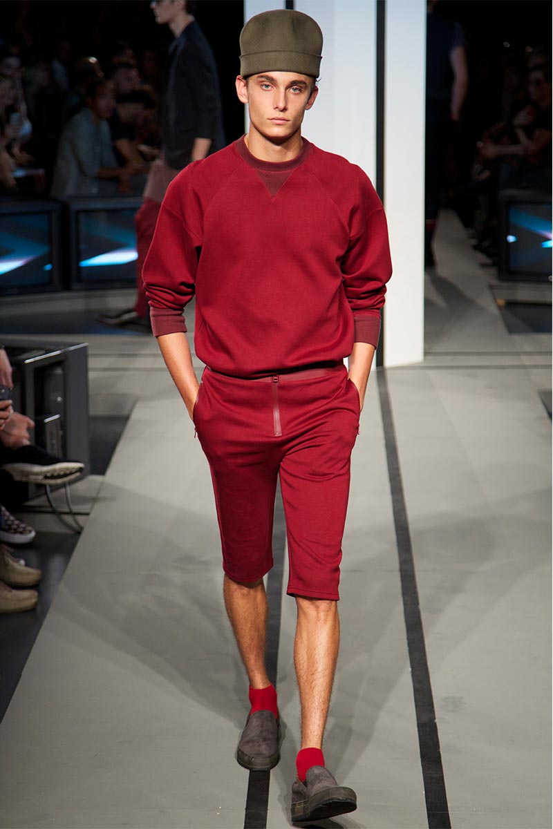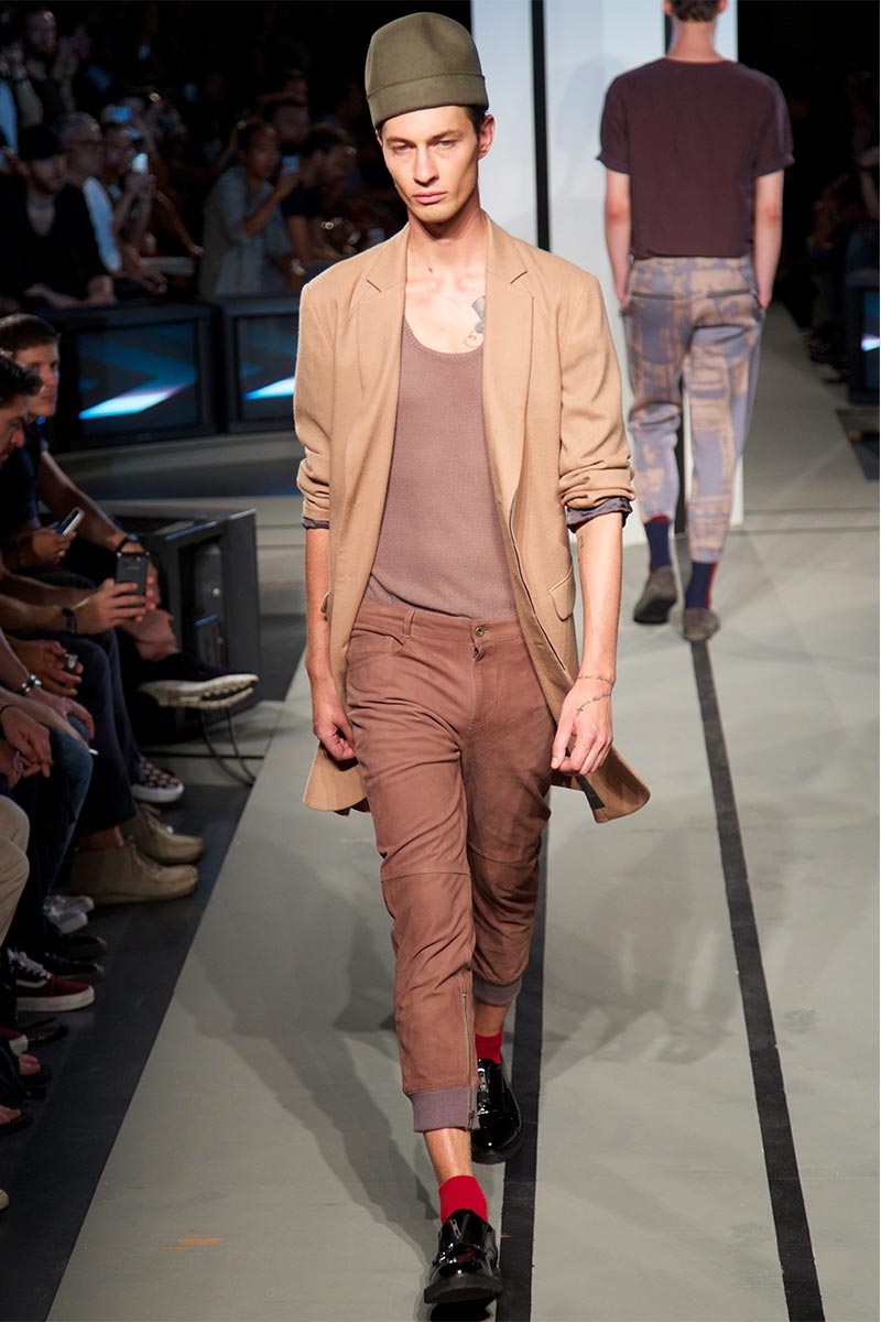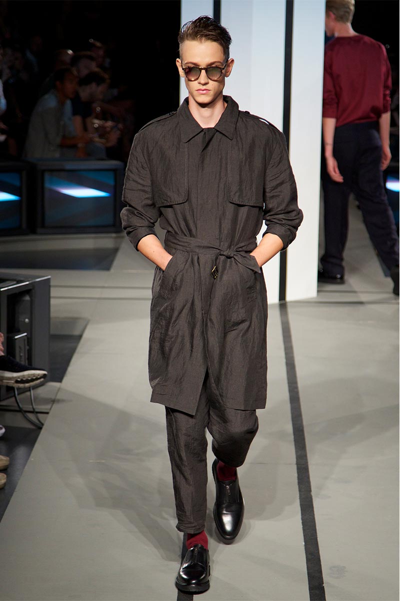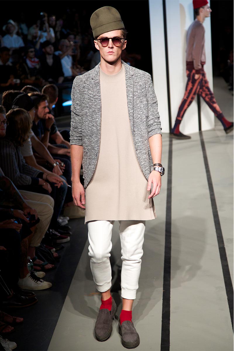 If there's a designer capable of elucidate references with unerring accuracy through the alluring construction of menswear clothes, is Robert Geller. Over the past years, across the timeline of his seasonal menswear collections, the designer proffered his fixative craze for David Bowie, Berlin, music, and constructivist art - just to name a few. But for Spring 2015, Geller found himself on another story trial, perhaps, a more experimental one. That particular philosophy conducted him towards a different context, one that reads extremely intriguing. This time attention was paid onto the two elements that reflect with precision his aesthetic, textile and color. For instance, Geller's preoccupation with color revealed the poetic and compelling attraction he has been propelling with consistency. His subdued, somber combinations of neutral tones, playing against simple, yet forward silhouettes, have that same winsome effect from previous collections. However, this offering states a new way of effortless dressing, one that does not compromises the classic garb of his menswear style.