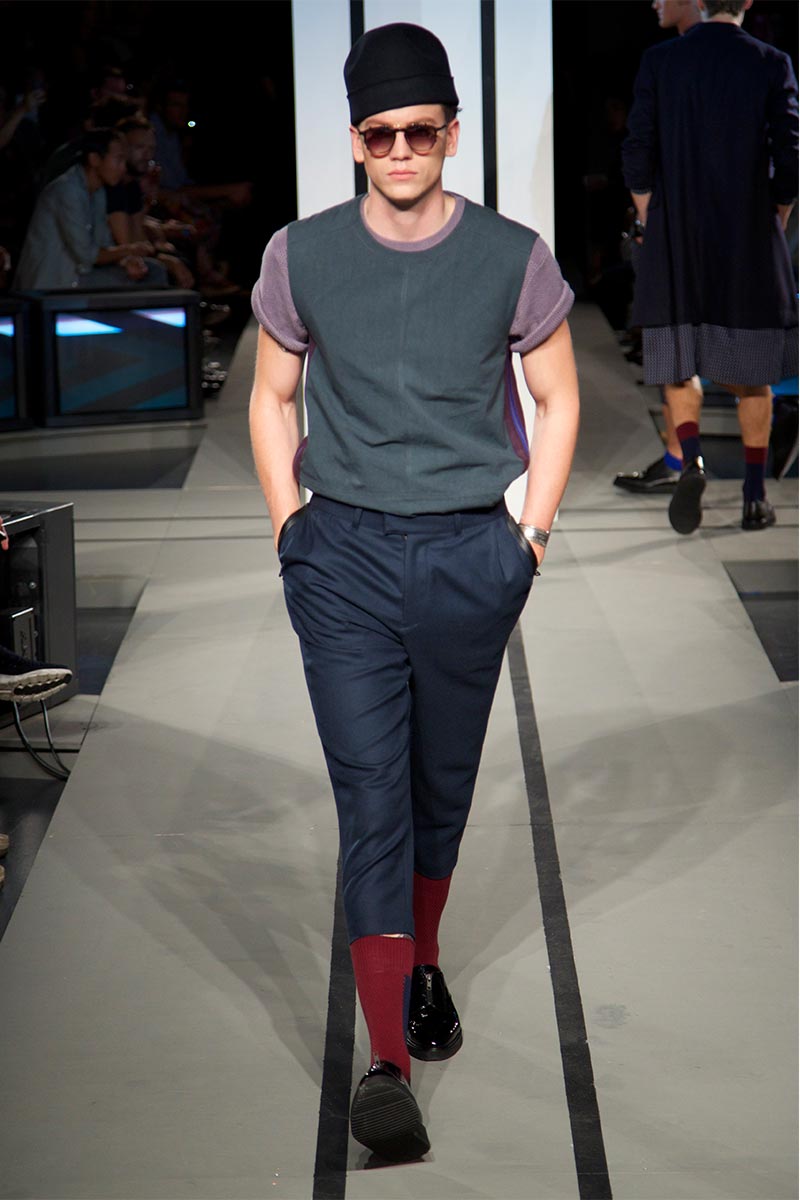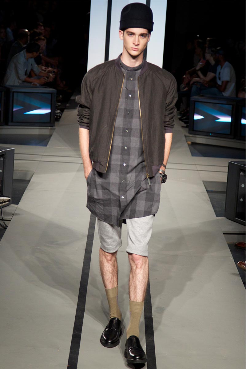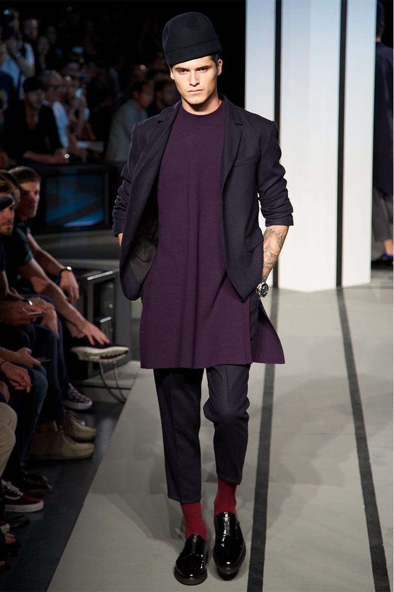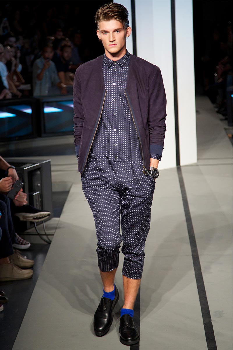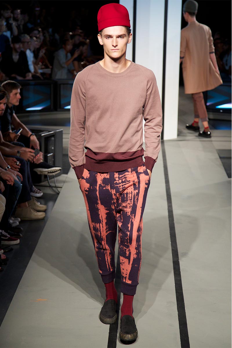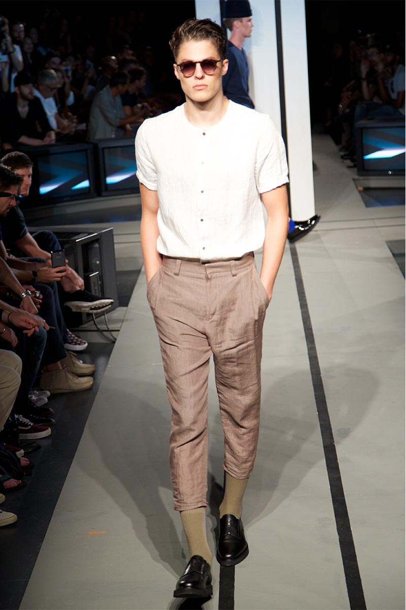 If there's a designer capable of elucidate references with unerring accuracy through the alluring construction of menswear clothes, is Robert Geller. Over the past years, across the timeline of his seasonal menswear collections, the designer proffered his fixative craze for David Bowie, Berlin, music, and constructivist art - just to name a few. But for Spring 2015, Geller found himself on another story trial, perhaps, a more experimental one. That particular philosophy conducted him towards a different context, one that reads extremely intriguing. This time attention was paid onto the two elements that reflect with precision his aesthetic, textile and color. For instance, Geller's preoccupation with color revealed the poetic and compelling attraction he has been propelling with consistency. His subdued, somber combinations of neutral tones, playing against simple, yet forward silhouettes, have that same winsome effect from previous collections. However, this offering states a new way of effortless dressing, one that does not compromises the classic garb of his menswear style.