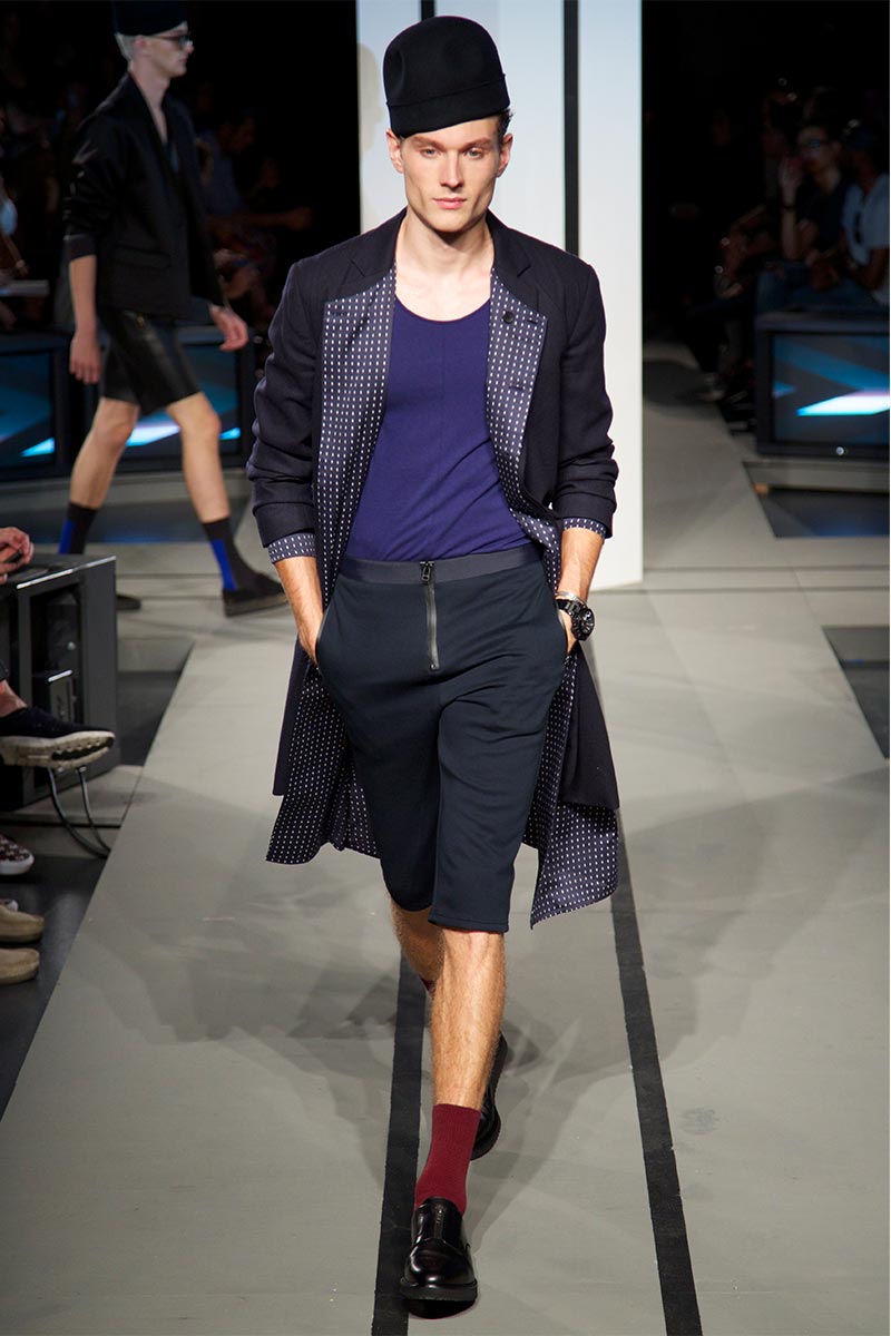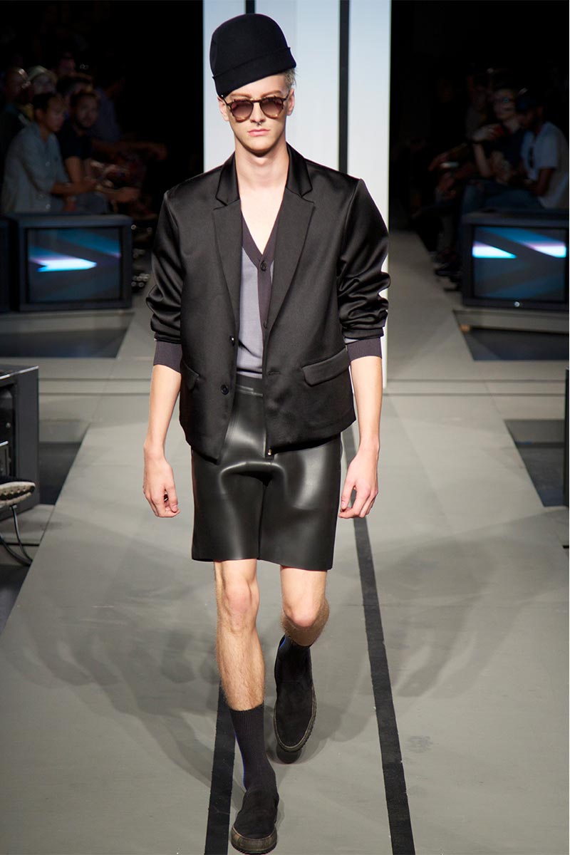 "What's modern? " - appointed the press releases about Geller's thoughts during the developing process of this collection. One immediate answer to that question was practical-essentialism, two words explored through length proportions, layering and silhouette variations. Another compelling element, and the one that reflected the collection's rawness and newness, was the paintbrush-strokes via print, achieved through an experimental process with squeegees and paintbrushes. Later, those were translated over the sleek texture of a neoprene jacket and shorts, or vividly seen with a grain effect on a knit, oversize top. Marrying the past with the present were his tunics, layered with blazers or jackets, alongside the fitted skinny shorts. Hats, the best ones seen at menswear shows, were done in collaboration with Weave Toshi, same with the eyewear by Garrett Leight and shoes by Common Projects x Robert Geller.