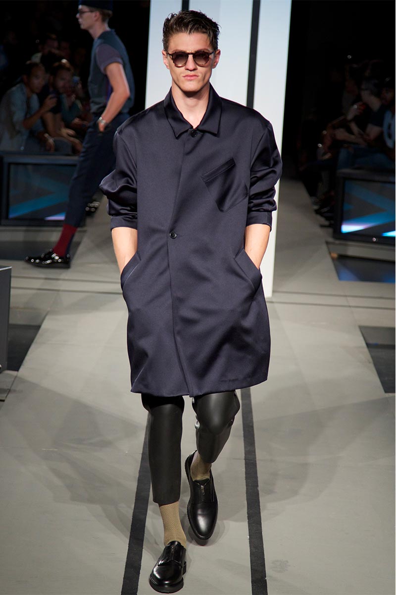 What really fascinated the audience was definitely Geller's impeccable delivery on detailing, while maintaining the simplicity of his pieces - hence there, the oblique placement of a shirt's pocket on the front of a navy coat, or the racing zippers running down the side piping of a skinny cropped-trouser, or the way he reinvented a parka's neckline by placing the one from a bomber jacket. Undoubtedly, it was a one man show. Even more so, because it had a personal touch, it felt closer to Geller's enterprising hope with menswear.