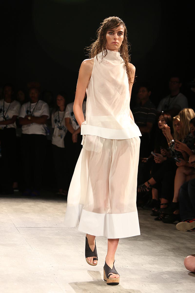 Although there was layering going on in some of the looks, they never felt or looked heavy. In fact, those looks moved quite beautifully down the runway as if a fan were in front of the models. The fabrics used were light weight, breathable, and allowed some movement, key ingredients one looks for in pieces during Spring/ Summer. The variety of textures featured in her modern designs went from sheer organza to heavy leather.
