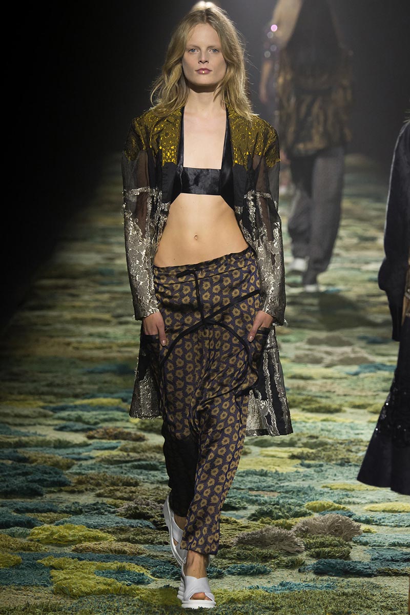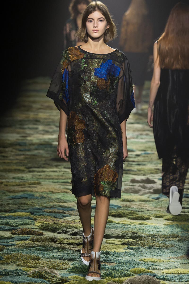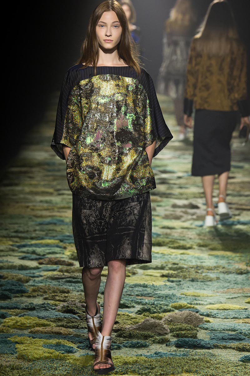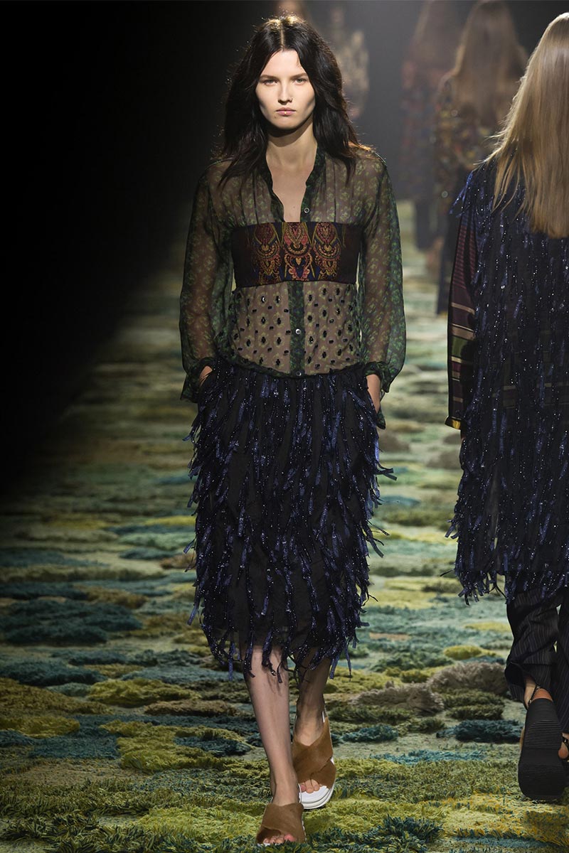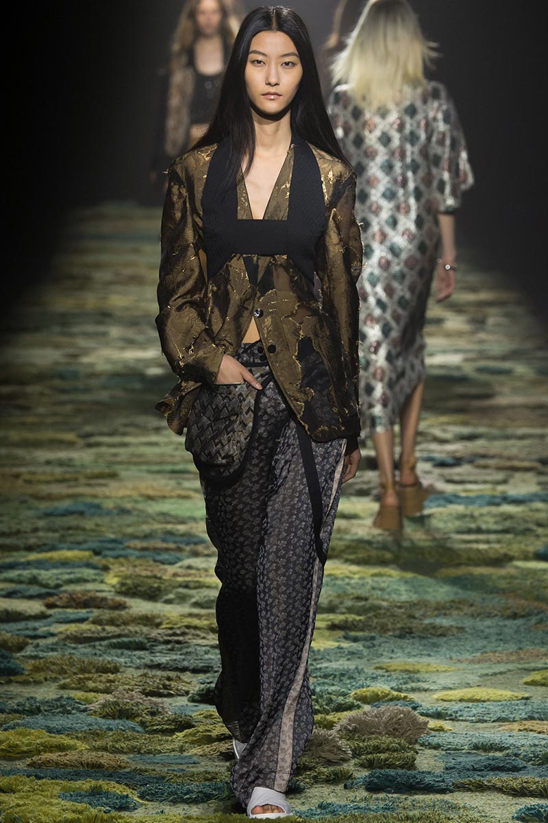 The grass tickled my bare feet and wind softly blew on my face as I skipped through the lush verdant untouched forest trying to find the perfect spot to settle down with my oversized blanket. Hypnotized by a sweet fragrance, I laid my blanket out and took a seat by a fallen trunk with wild flowers blooming out of its decaying orifice. All around me large, rich pillars loomed above me to a majestic canopy. Cracks of light broke through in a golden stream from the heavens and kissed parts of a multitoned moss filled trail outlined by robust trunks, wild flowers, and… I quickly smacked myself into reality and focused on the clothes peacefully gracing the runway. Dries Van Noten has always been successful in transporting his spectators to a different world with his settings through use of music, lighting, and props. This year was no different, with the sound of birds chirping and the blowing of gentle winds playing in the background, along with a custom made carpet by Argentinean artist Alexandra Kehayoglou mimicking a moss trail, and dusky golden lighting mimicking sunlight seeping through a dense canopy, it was no surprise my enchanted senses placed me in a lush dreamlike forest for the show.