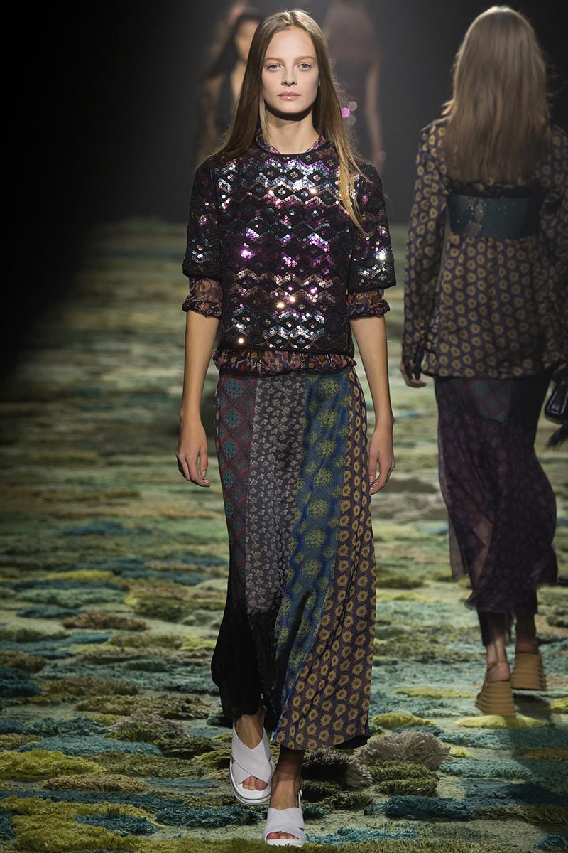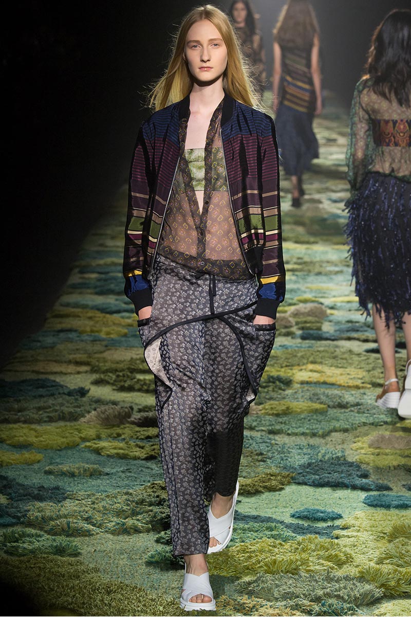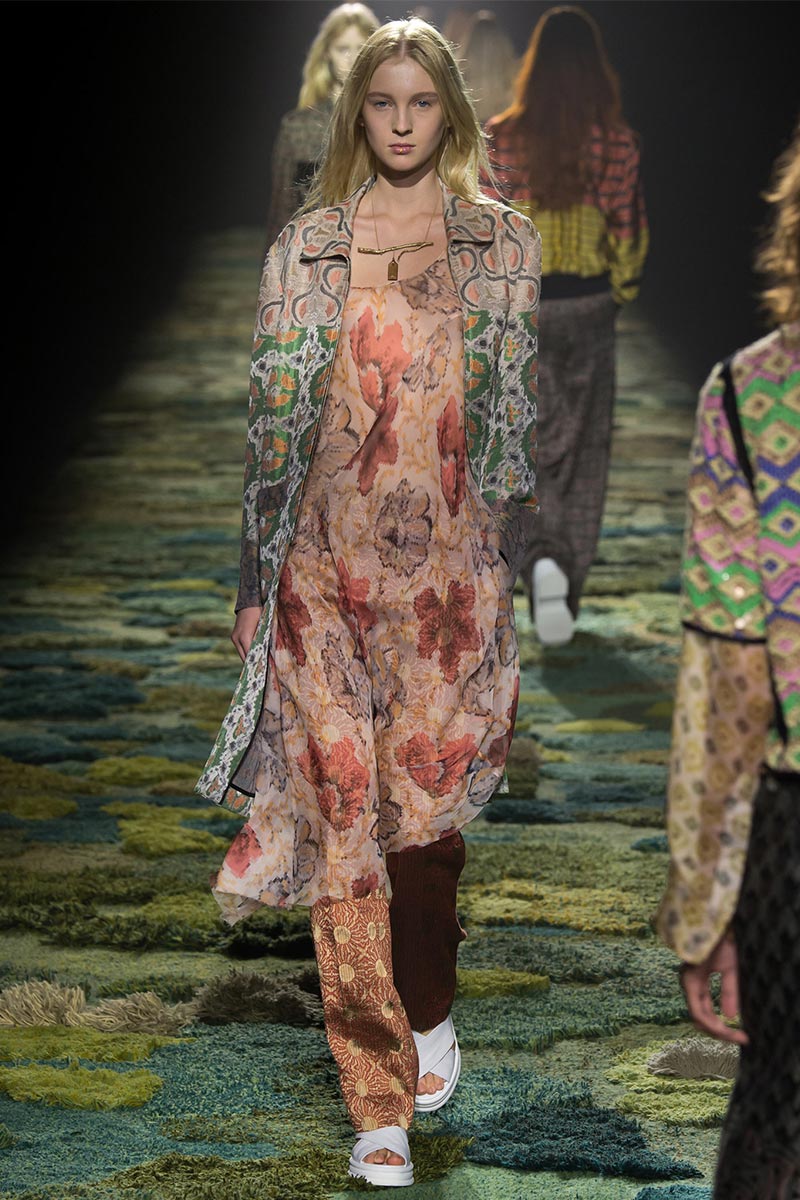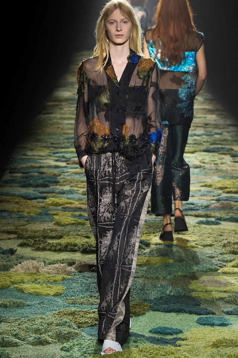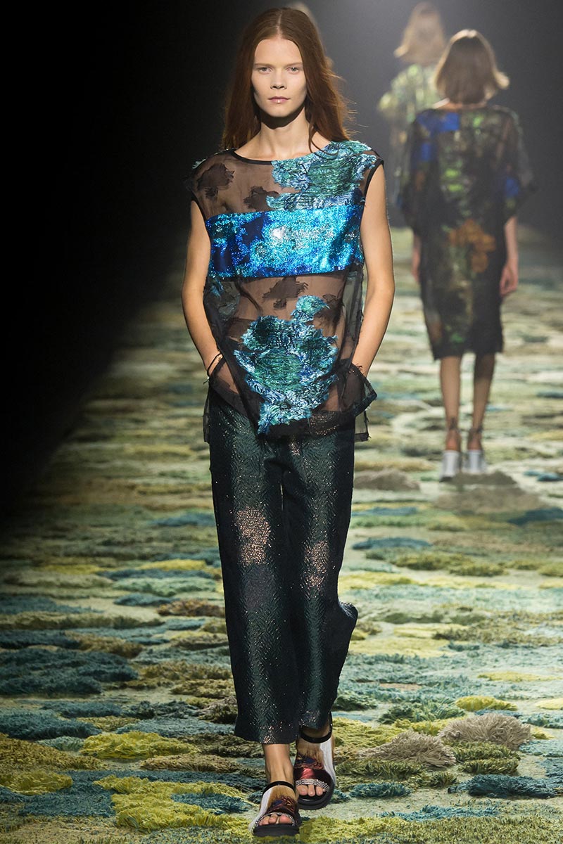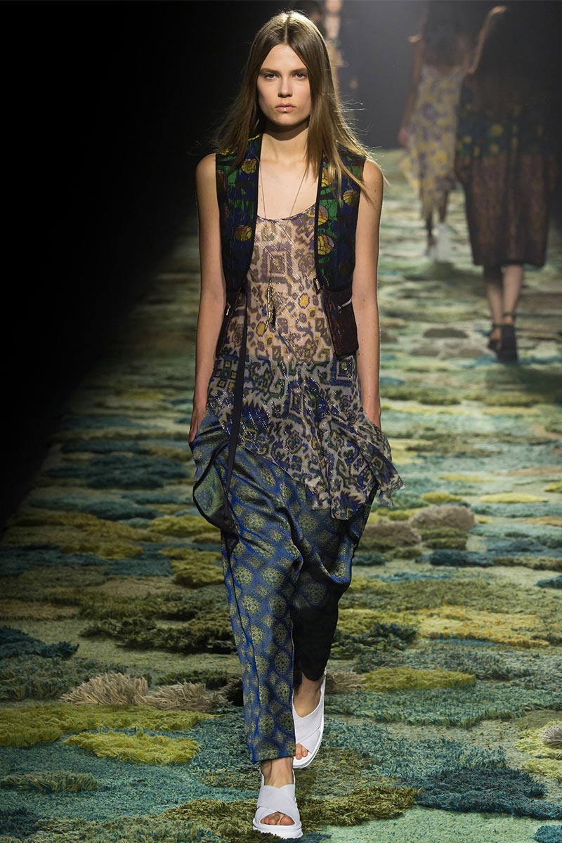 The grass tickled my bare feet and wind softly blew on my face as I skipped through the lush verdant untouched forest trying to find the perfect spot to settle down with my oversized blanket. Hypnotized by a sweet fragrance, I laid my blanket out and took a seat by a fallen trunk with wild flowers blooming out of its decaying orifice. All around me large, rich pillars loomed above me to a majestic canopy. Cracks of light broke through in a golden stream from the heavens and kissed parts of a multitoned moss filled trail outlined by robust trunks, wild flowers, and… I quickly smacked myself into reality and focused on the clothes peacefully gracing the runway. Dries Van Noten has always been successful in transporting his spectators to a different world with his settings through use of music, lighting, and props. This year was no different, with the sound of birds chirping and the blowing of gentle winds playing in the background, along with a custom made carpet by Argentinean artist Alexandra Kehayoglou mimicking a moss trail, and dusky golden lighting mimicking sunlight seeping through a dense canopy, it was no surprise my enchanted senses placed me in a lush dreamlike forest for the show.