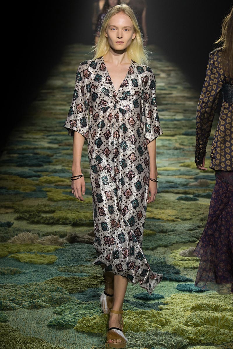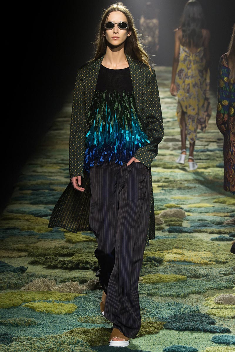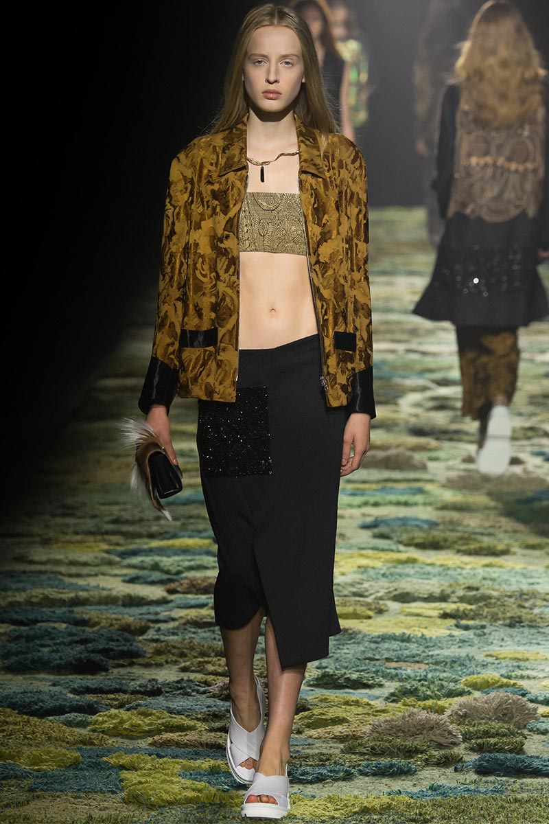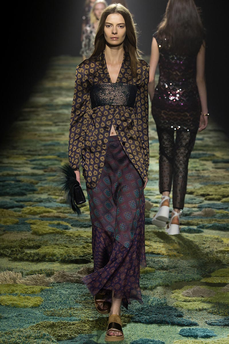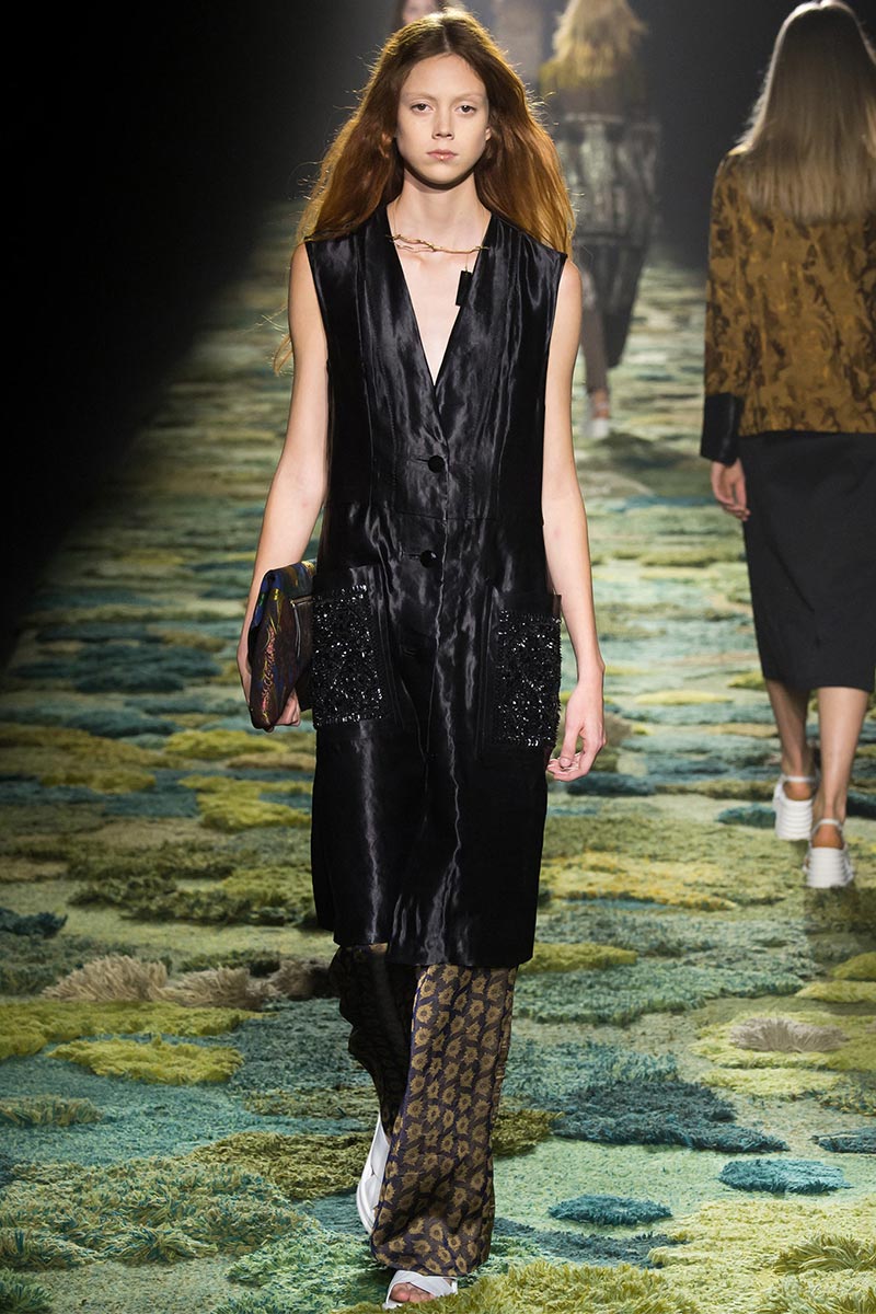 The grass tickled my bare feet and wind softly blew on my face as I skipped through the lush verdant untouched forest trying to find the perfect spot to settle down with my oversized blanket. Hypnotized by a sweet fragrance, I laid my blanket out and took a seat by a fallen trunk with wild flowers blooming out of its decaying orifice. All around me large, rich pillars loomed above me to a majestic canopy. Cracks of light broke through in a golden stream from the heavens and kissed parts of a multitoned moss filled trail outlined by robust trunks, wild flowers, and… I quickly smacked myself into reality and focused on the clothes peacefully gracing the runway. Dries Van Noten has always been successful in transporting his spectators to a different world with his settings through use of music, lighting, and props. This year was no different, with the sound of birds chirping and the blowing of gentle winds playing in the background, along with a custom made carpet by Argentinean artist Alexandra Kehayoglou mimicking a moss trail, and dusky golden lighting mimicking sunlight seeping through a dense canopy, it was no surprise my enchanted senses placed me in a lush dreamlike forest for the show.