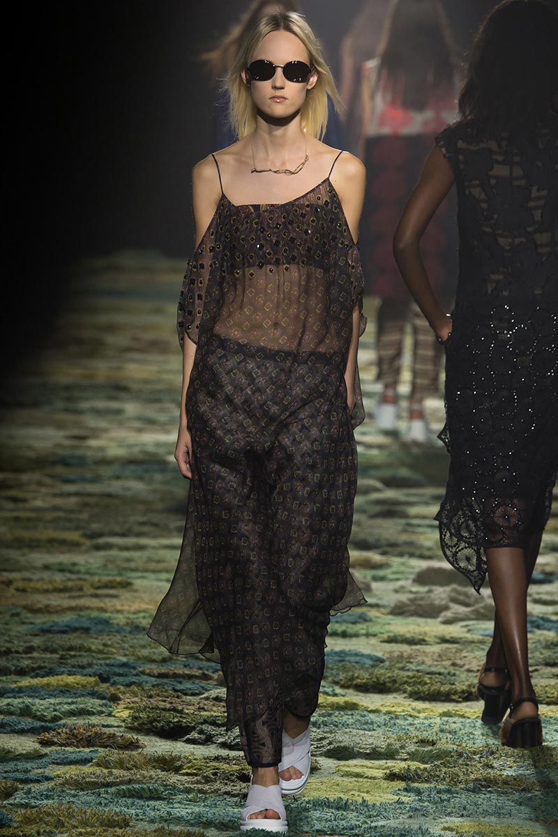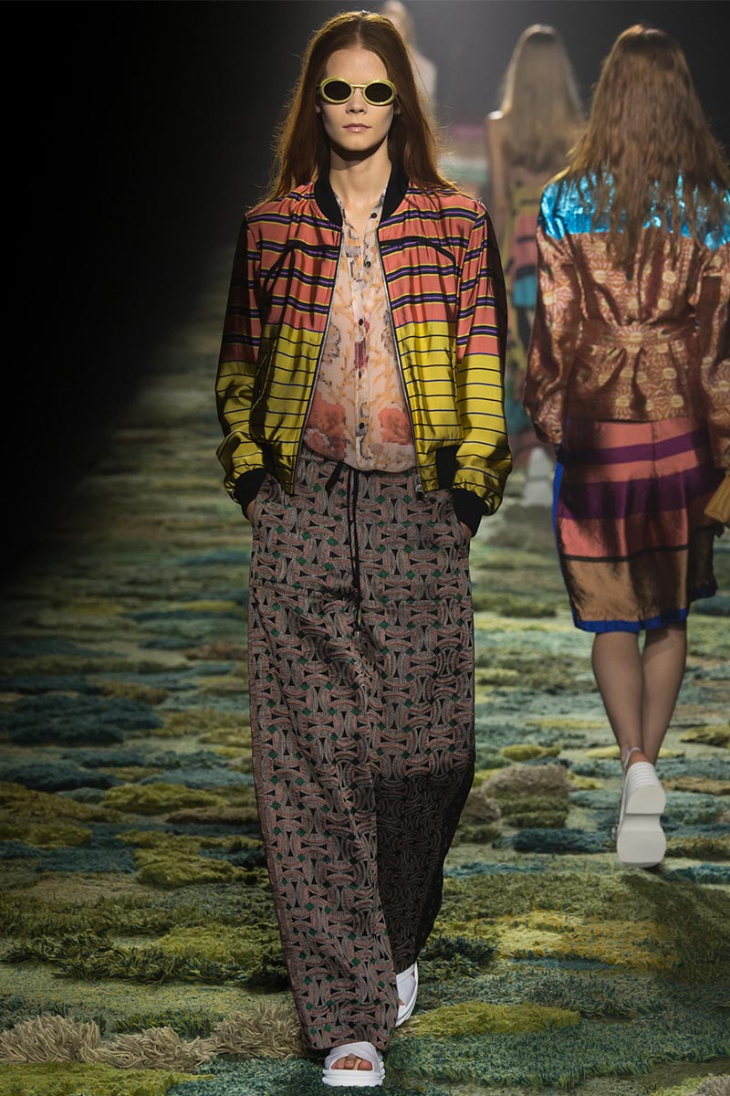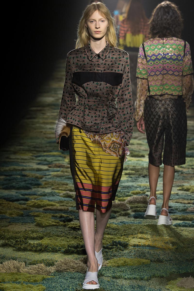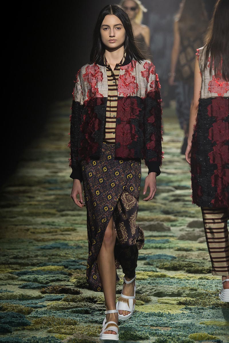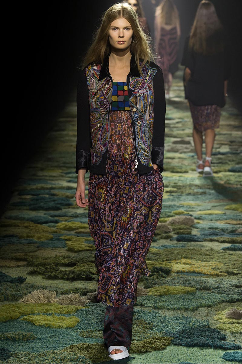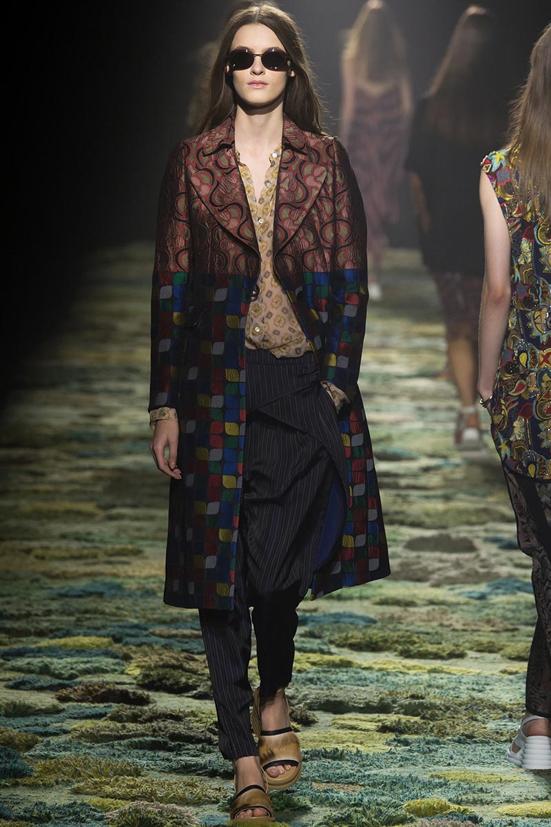 The grass tickled my bare feet and wind softly blew on my face as I skipped through the lush verdant untouched forest trying to find the perfect spot to settle down with my oversized blanket. Hypnotized by a sweet fragrance, I laid my blanket out and took a seat by a fallen trunk with wild flowers blooming out of its decaying orifice. All around me large, rich pillars loomed above me to a majestic canopy. Cracks of light broke through in a golden stream from the heavens and kissed parts of a multitoned moss filled trail outlined by robust trunks, wild flowers, and… I quickly smacked myself into reality and focused on the clothes peacefully gracing the runway. Dries Van Noten has always been successful in transporting his spectators to a different world with his settings through use of music, lighting, and props. This year was no different, with the sound of birds chirping and the blowing of gentle winds playing in the background, along with a custom made carpet by Argentinean artist Alexandra Kehayoglou mimicking a moss trail, and dusky golden lighting mimicking sunlight seeping through a dense canopy, it was no surprise my enchanted senses placed me in a lush dreamlike forest for the show.