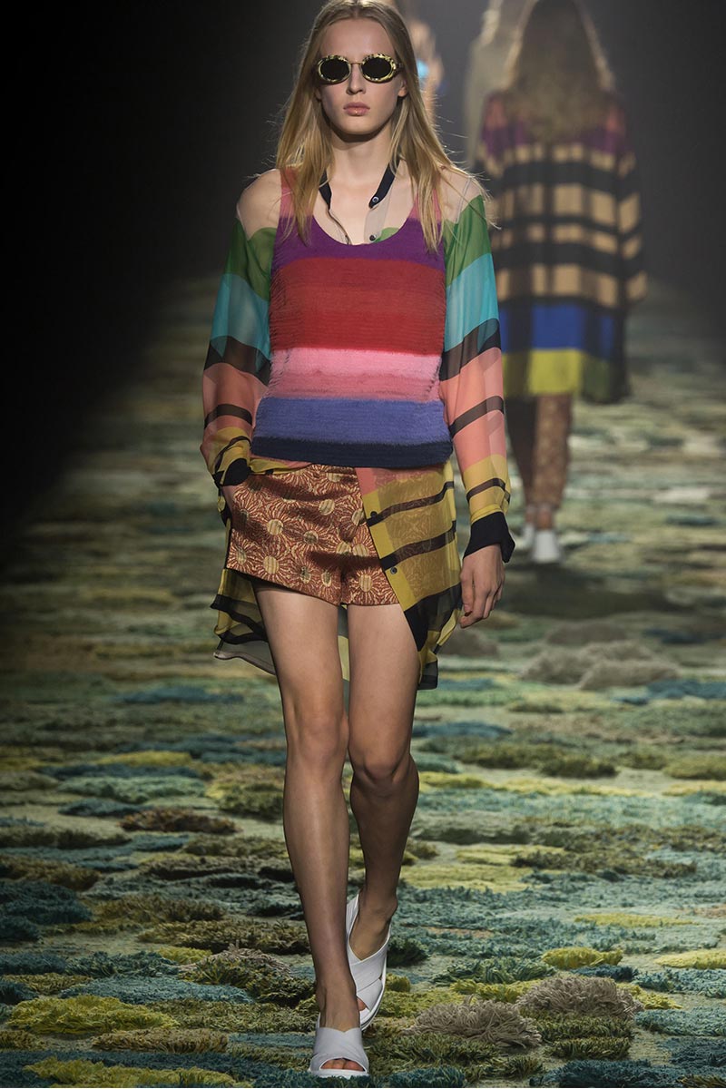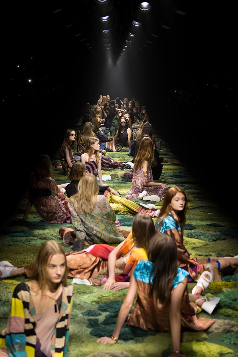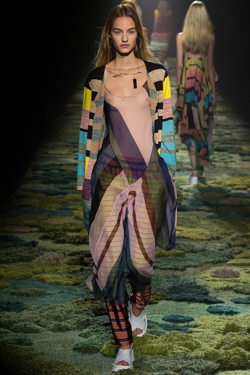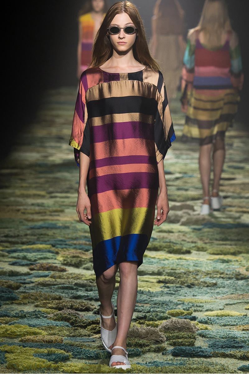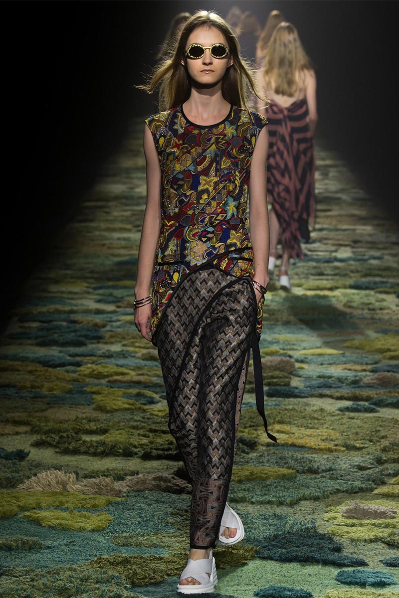 The grass tickled my bare feet and wind softly blew on my face as I skipped through the lush verdant untouched forest trying to find the perfect spot to settle down with my oversized blanket. Hypnotized by a sweet fragrance, I laid my blanket out and took a seat by a fallen trunk with wild flowers blooming out of its decaying orifice. All around me large, rich pillars loomed above me to a majestic canopy. Cracks of light broke through in a golden stream from the heavens and kissed parts of a multitoned moss filled trail outlined by robust trunks, wild flowers, and… I quickly smacked myself into reality and focused on the clothes peacefully gracing the runway. Dries Van Noten has always been successful in transporting his spectators to a different world with his settings through use of music, lighting, and props. This year was no different, with the sound of birds chirping and the blowing of gentle winds playing in the background, along with a custom made carpet by Argentinean artist Alexandra Kehayoglou mimicking a moss trail, and dusky golden lighting mimicking sunlight seeping through a dense canopy, it was no surprise my enchanted senses placed me in a lush dreamlike forest for the show.