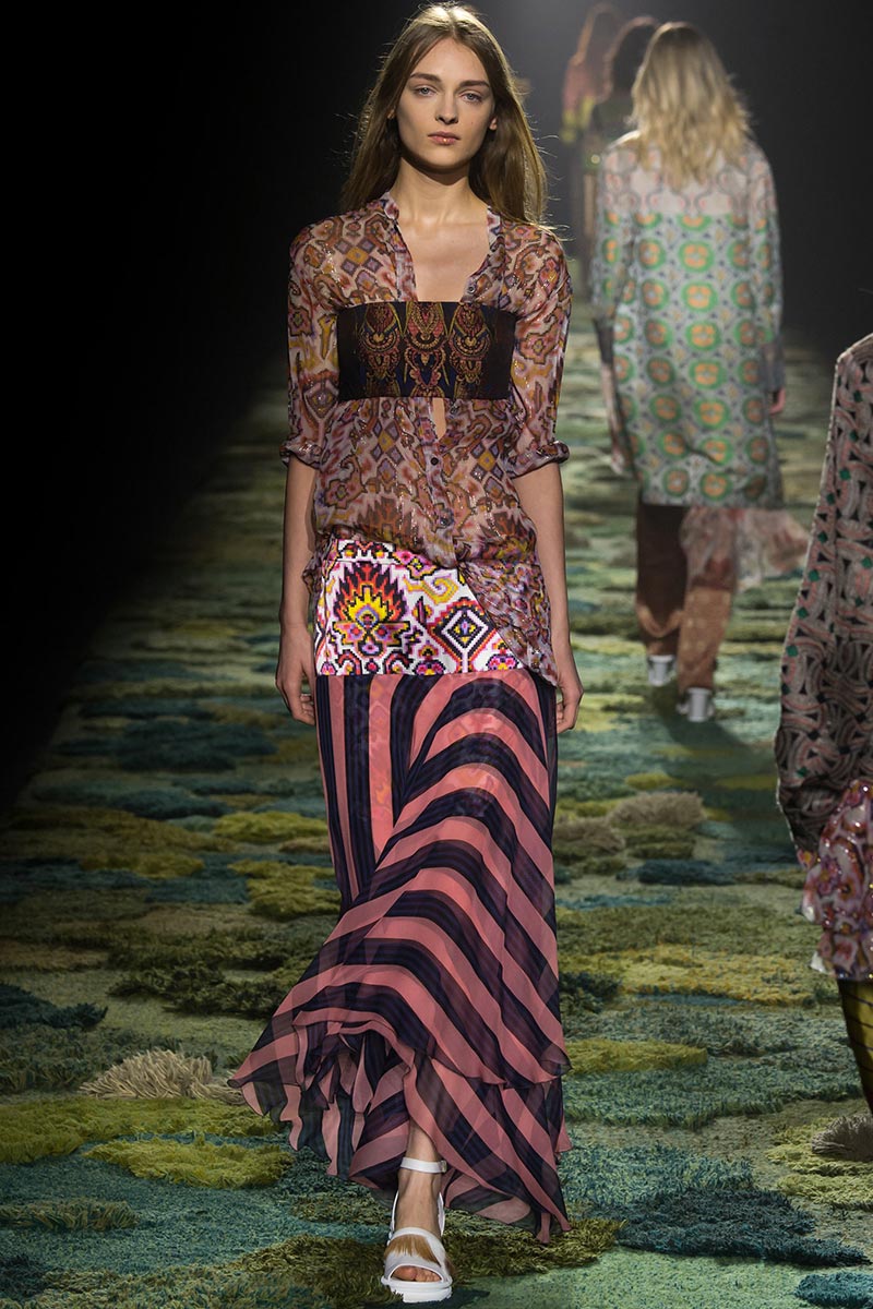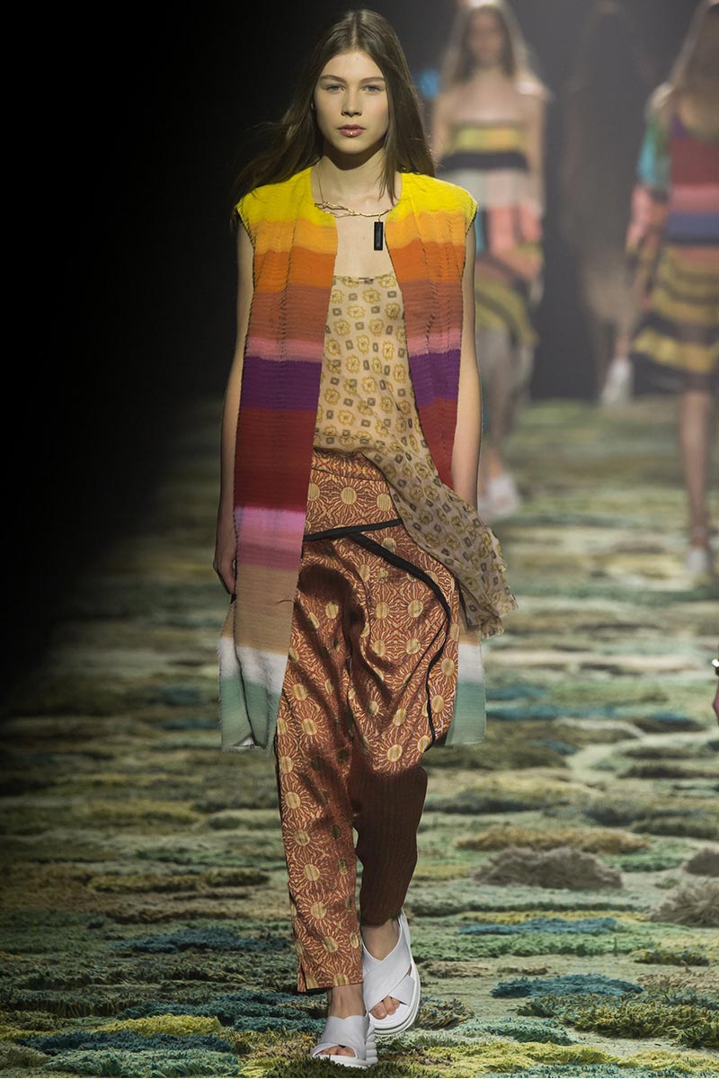 Throughout the show, I saw natural “no make-up†faces and hair parted down the middle giving off a hippie vibe, while the dreamy gossamer and gilded fabrics added a fairy-tale element. The models looked as if they were magical forest fairies set in the 1970’s, all against the demolition of forests and all for peace, love, and equality. Stunning colored jacquards, gilded color striped silk, striped organza, patched brocade graced the models mythical bodies as bandeau tops, oversized blouses, flowy ankle length skirts, coats, multitier dresses, and narrow pants. With pattern on top of pattern on top of pattern, the looks never looked overdone; it allowed for endless styling possibilities. A standout look was a pale yellow and purple patterned filmy blouse with metallic block striped pants in a kaleidoscope of colors; completed with a neutral jacquard coat, a leather and fur clutch, and a delicate golden twig clasping her neck. Another stand out piece was what the designer called “Summer fur†during an interview with WWD.com, from afar it looked like a block striped laser cut fur vest; (look number 7) in reality they were chiffon strips stitched closely together giving the garment a fur like appearance … Breathtaking! I cannot forget to mention the intricate and almost impossible to recreate jacquards, all done in one woven piece they revealed two or more different weaves: a coat with the top half in a pale red and dusty golden print leading into an unfinished rubik cube-like patterned bottom half.