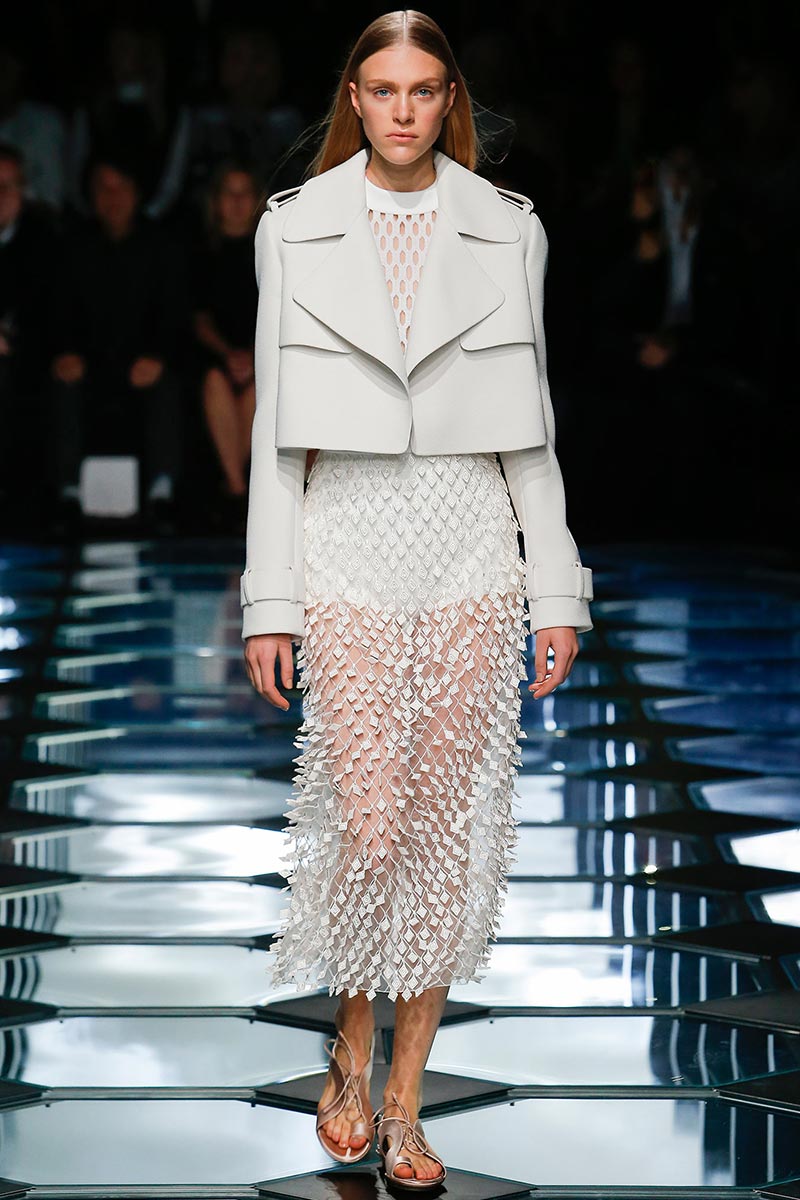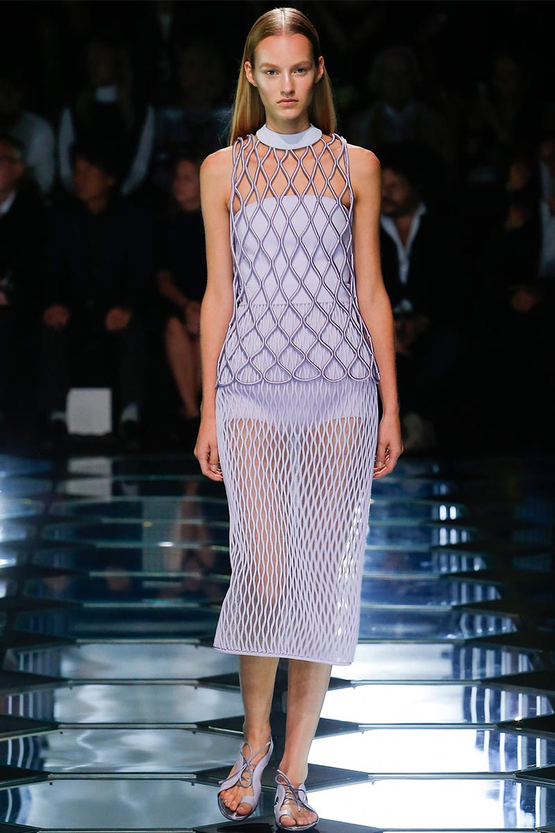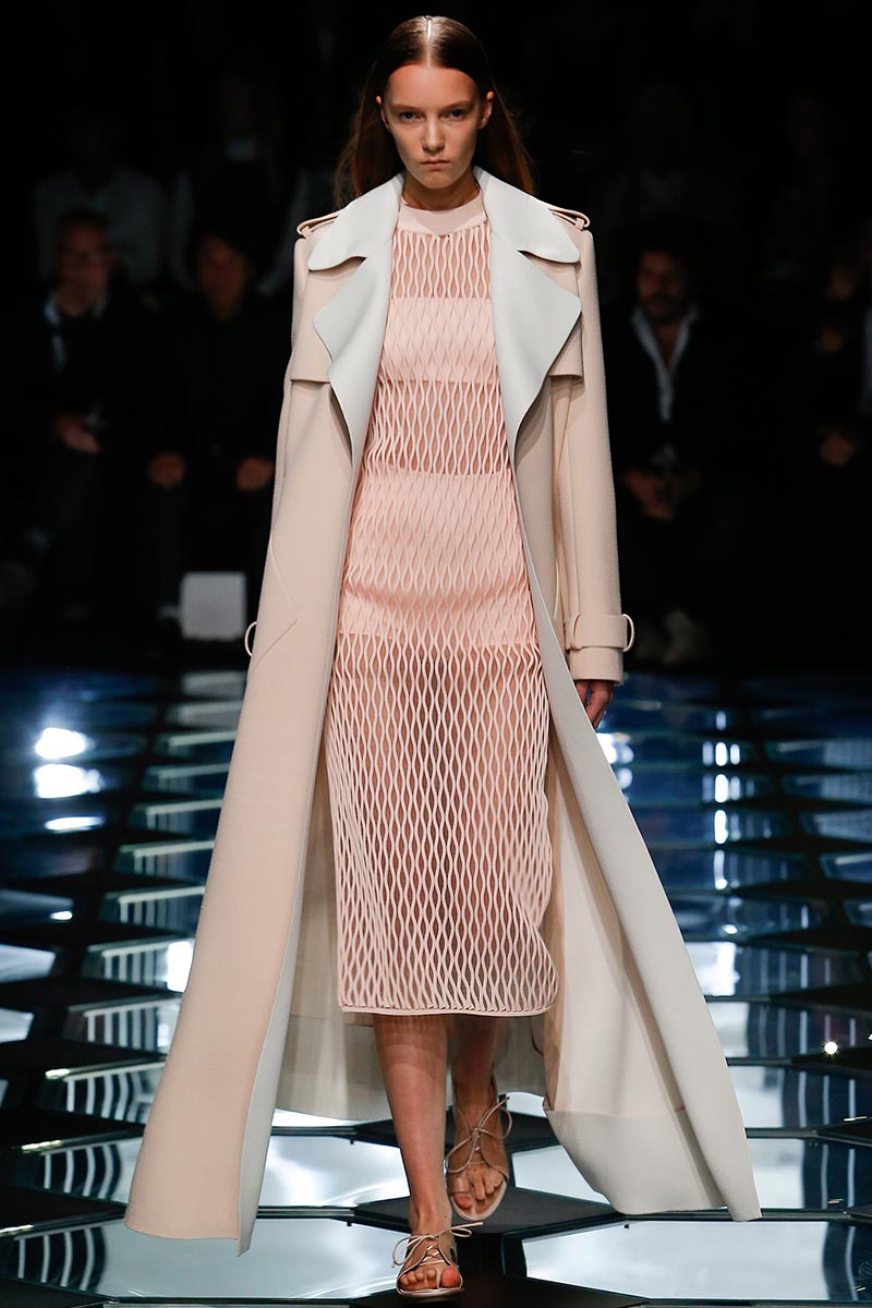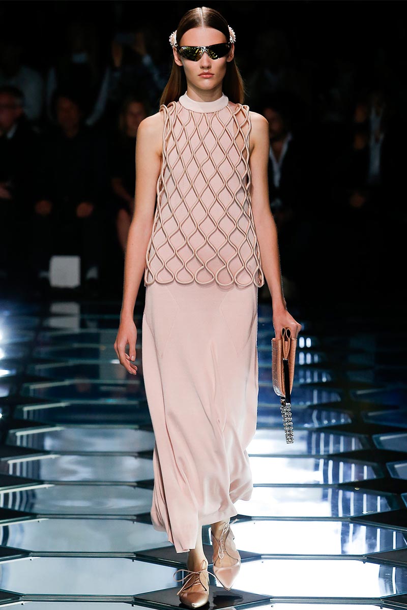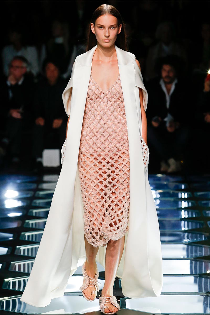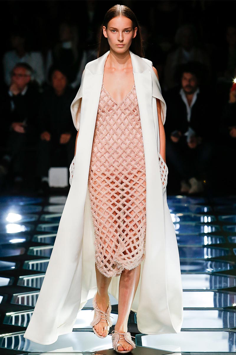 Alexander Wang's aesthetic at Balenciaga is starting to set right in place. His latest outing for Spring 2015 expresses a balance between the history and the remarkable codes that Nicolas Ghesquière stablished during the years of his tenure. A conscious combination of segments that fair enough depict the past, present, and future of the house DNA, through an assertive vision that evokes emblematic and straightforward references; those, particularly ranging from the grid flooring of Cristóbal Balenciaga's atelier, to the clothing that features rhombic-nets reminiscent of Ghesquière's Fall 2011. But between the paying-homage-ideas there's also Wang's own ingredient too, which undoubtedly came from the ready-to-be-worn easiness of the clothes.