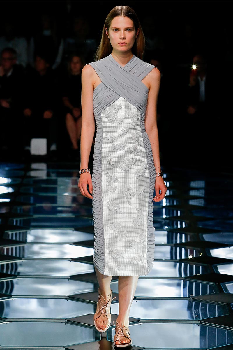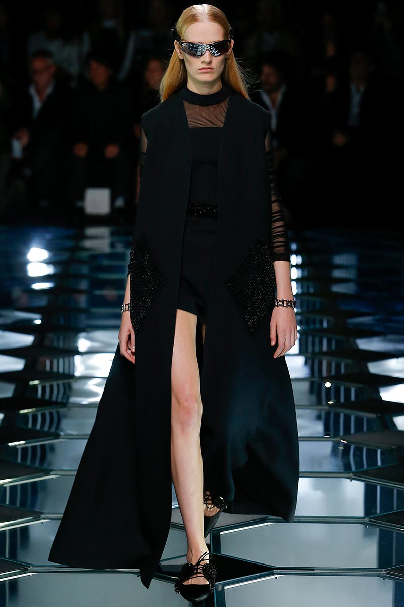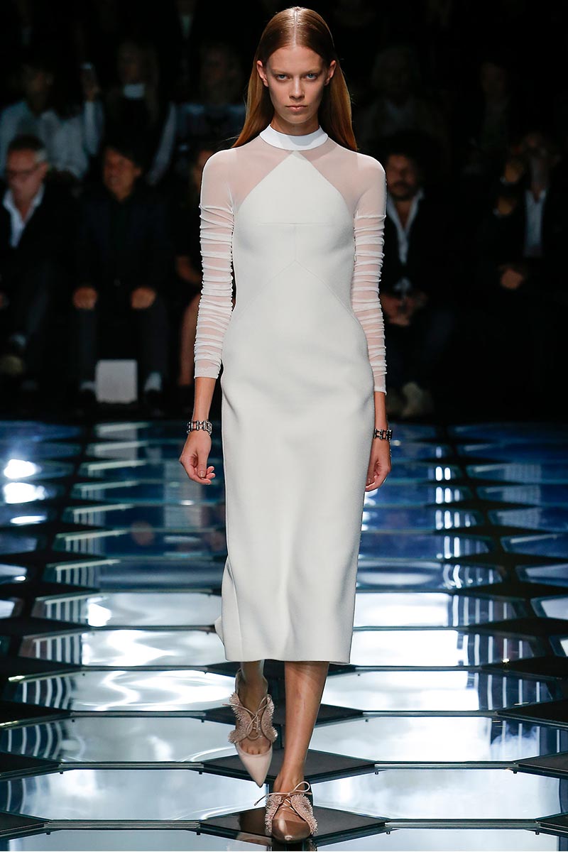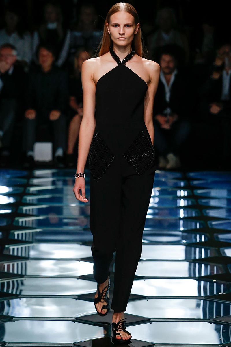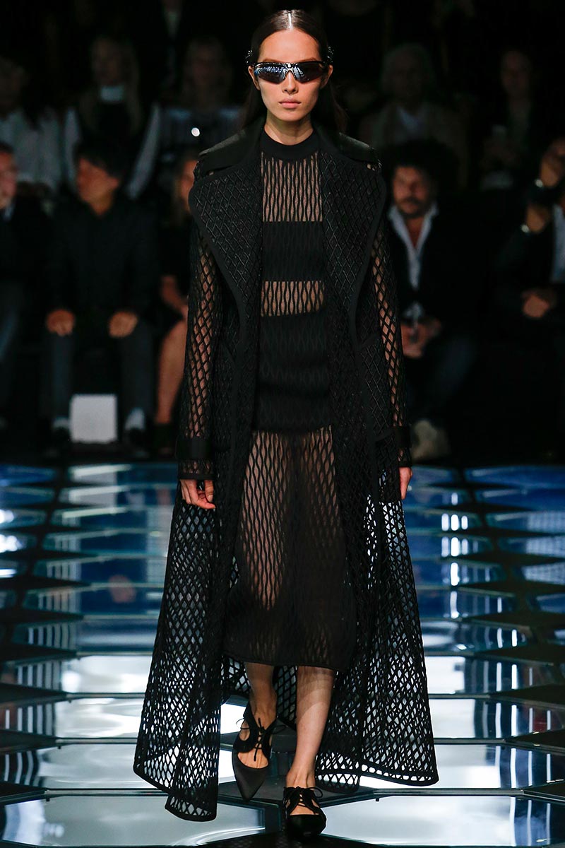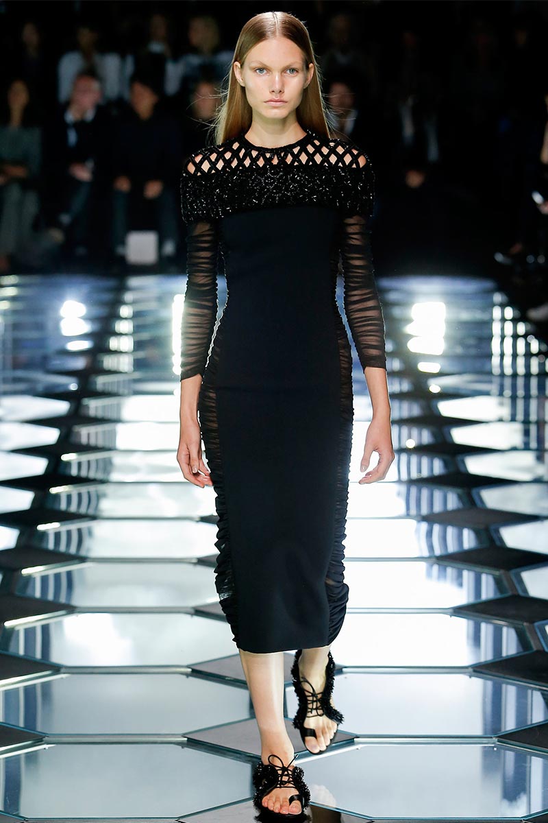 Alexander Wang's aesthetic at Balenciaga is starting to set right in place. His latest outing for Spring 2015 expresses a balance between the history and the remarkable codes that Nicolas Ghesquière stablished during the years of his tenure. A conscious combination of segments that fair enough depict the past, present, and future of the house DNA, through an assertive vision that evokes emblematic and straightforward references; those, particularly ranging from the grid flooring of Cristóbal Balenciaga's atelier, to the clothing that features rhombic-nets reminiscent of Ghesquière's Fall 2011. But between the paying-homage-ideas there's also Wang's own ingredient too, which undoubtedly came from the ready-to-be-worn easiness of the clothes.