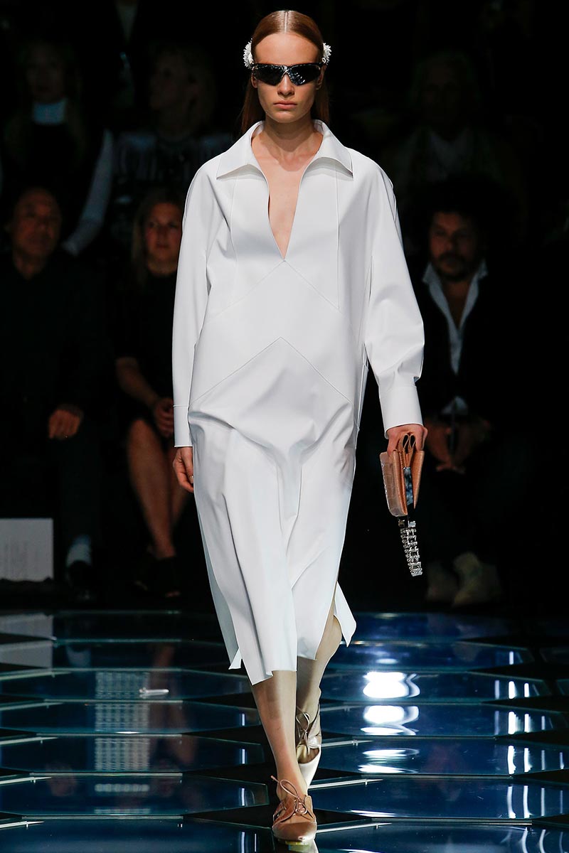 Reviewing the details that defined the archives as timeless was a cornerstone for Wang - who understands how important Balenciaga collections were in the past as they should be now. By that, his emphasis went onto wearability as key component, alongside implementing the couture trademarks of the house without exception. That message was immediately visible through the first two looks of the collection, featuring structured and capacious floor-length coats that might classify as modern versions of Cristóbal's monastic and voluminous s'60 couture-veils. Wang updated the feel of those pieces with sport appeal, and paired them with short-shorts and long-sleeve mock-neck tops to convey the urgency, philosophy of today's women dress codes. That athletic fervor also filtered through the collection's silhouettes and details: Body-con dresses with mix-match detailing; variations on the lengths; architectural straight lines; polo-shirt and sweatshirt necklines - an amalgamation that leads to comfort. The simplicity of a white gown with mid-length sleeves, or the structured, oversize shirtdress, both exude with accuracy the house's new approach on minimalism as essential way of dressing.