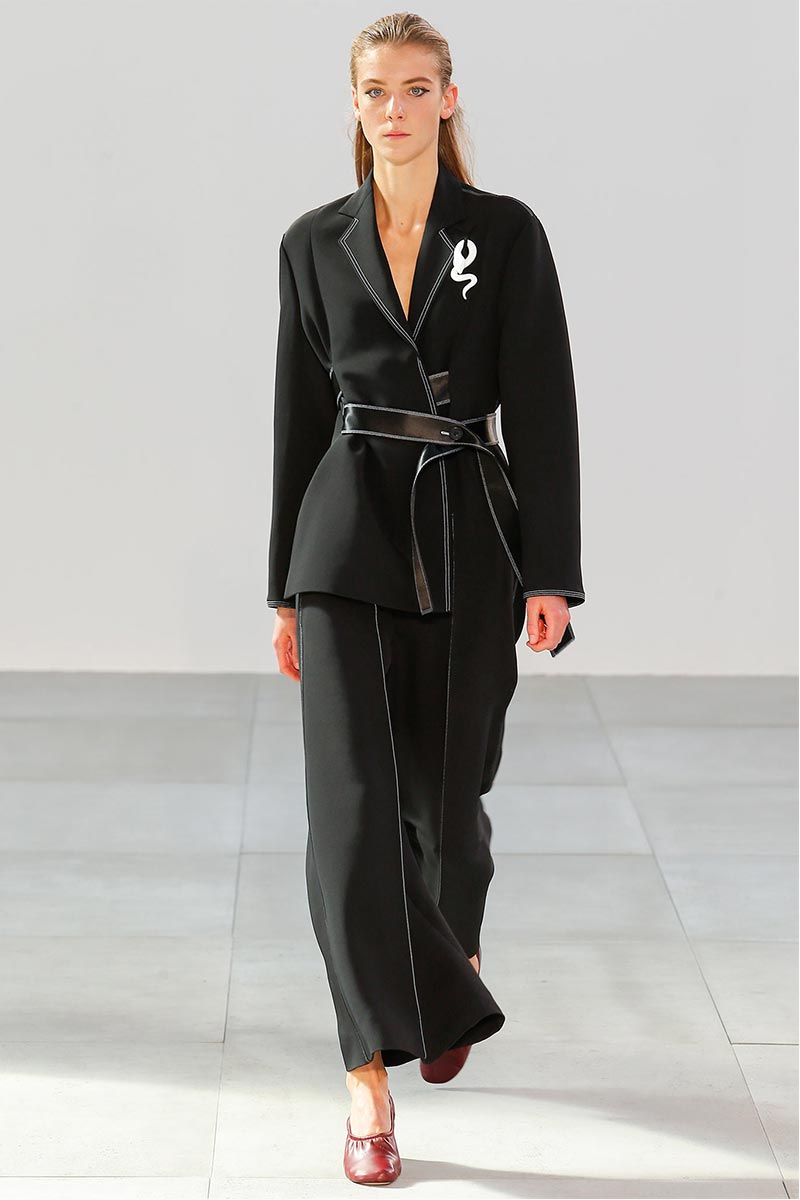 That self-assurance and introspection is embodied through lightness and movement, achieved via (stretchy-knit) tank-dresses that conclude in a burst of swingy, bouncy, fringe-foliage; the same intriguing flair is present on the v-neck-shirt-dresses, constructed from horizontal bands, each releasing extents of textile excess on both sides. The thick, wrinkled, embossed-textile used for utilitarian coats, embrace that sought-after Céline garb. While the elongated tank-tops, angularly slashed across the upper bust-area, or the skirts with front-back slits, have that provocative and revealing touch that might classify as unfamiliar territory for those Philo-to-death followers. New codes of femininity where captured in the moments when a hip-bone was revealed through circular gaps, or when a collage of flowered textiles was implemented for the architectural-construction of wrap dresses. The vulnerable side of the collection came from the humble feel of details: the simplicity of bags; the gold bells suspended around the waist with a simple cotton strand; or the hand, the snake and lip brooches made from the most unpretentious and delicate material, porcelain.