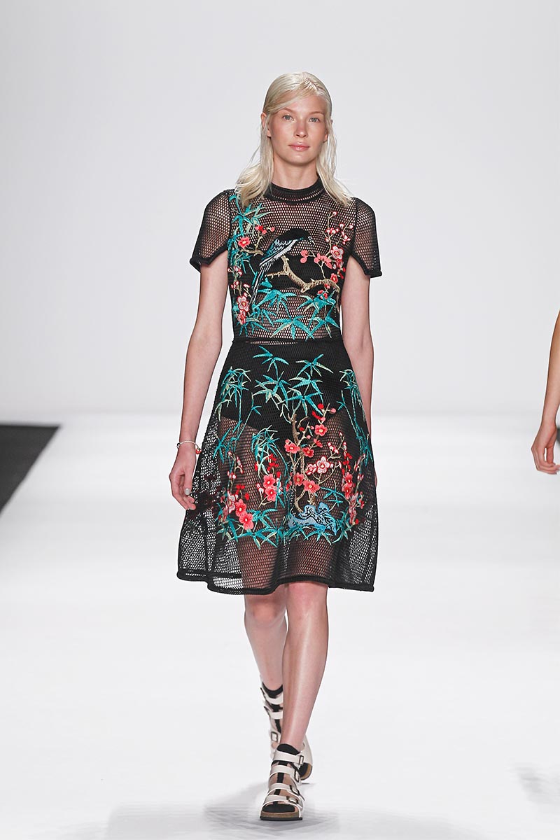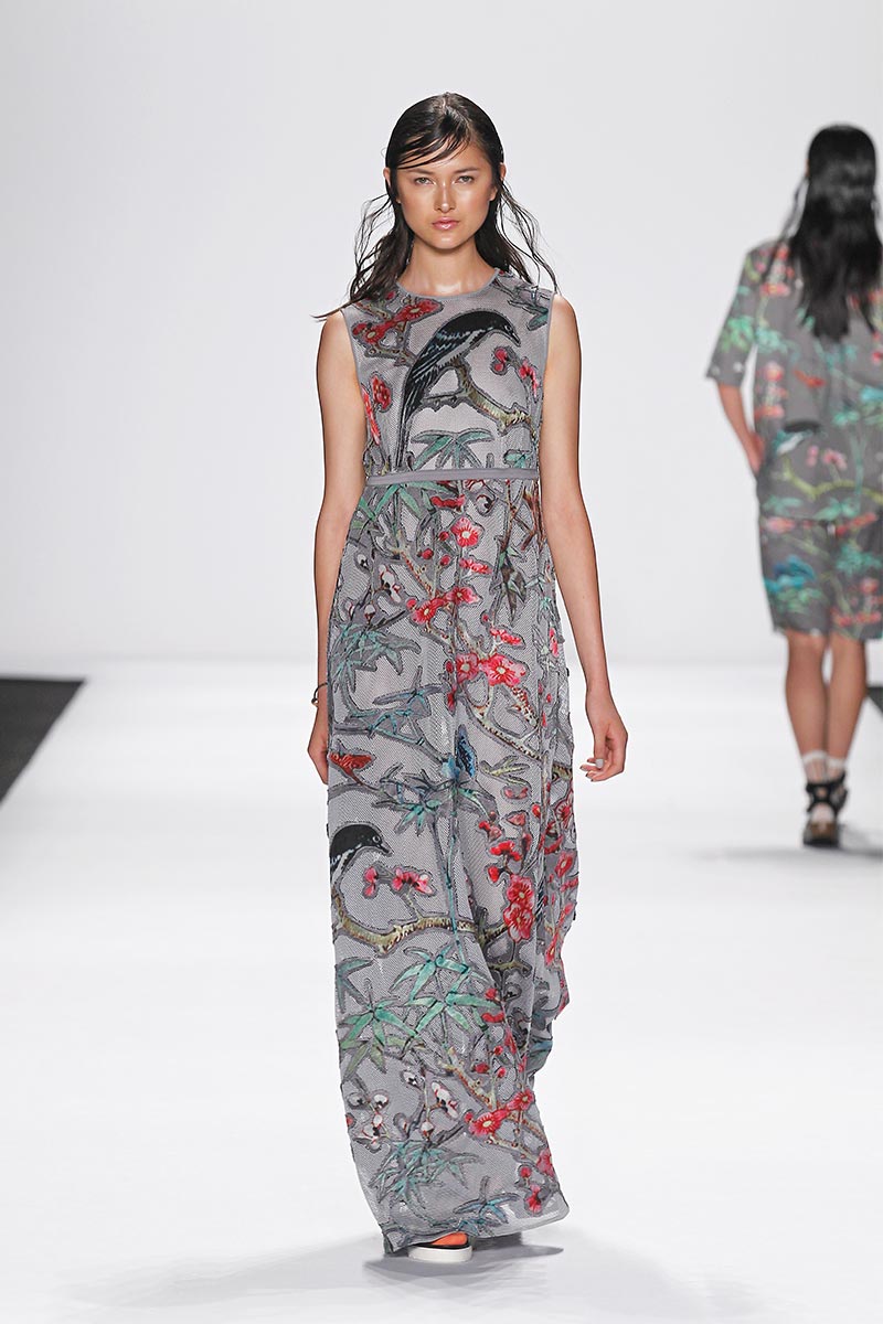 VT: this season I was inspired by technology and nature. I was so inspired by the images found in objects and painting in the forbidden city from my last trip. and those images of birds, nature, motion waves and landscape were so beautiful. I loved them so much that I interpreted them into embroideries, cut outs and appliqués. but applying them into power mesh when they’re opposites; it’s different, I love that.