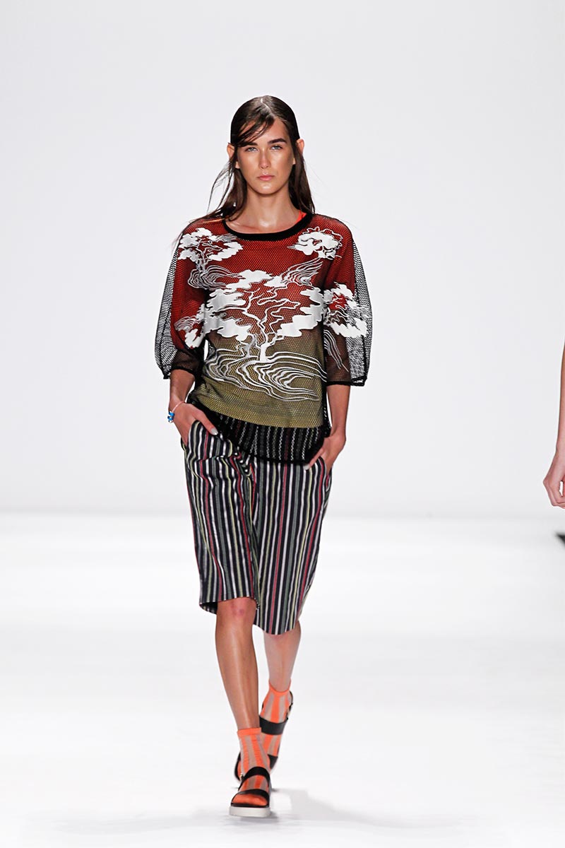 Every look evolved into the next one, reflecting the free spiritedness of the 60s and 70s through a-line silhouettes, shift dresses, mini skirts, bermuda shorts and pajama pants that transited between landscapes, tidal waves, and scenes from nature. A strong, dynamic feel propelled by the runway's soundtrack that pulled spectators into Tam's creative passage. Prints and boyish overlays iterated a modern context, combined with feminine expressions of embroideries and definitive sneak cut outs that scented a polished and refined craftsmanship.